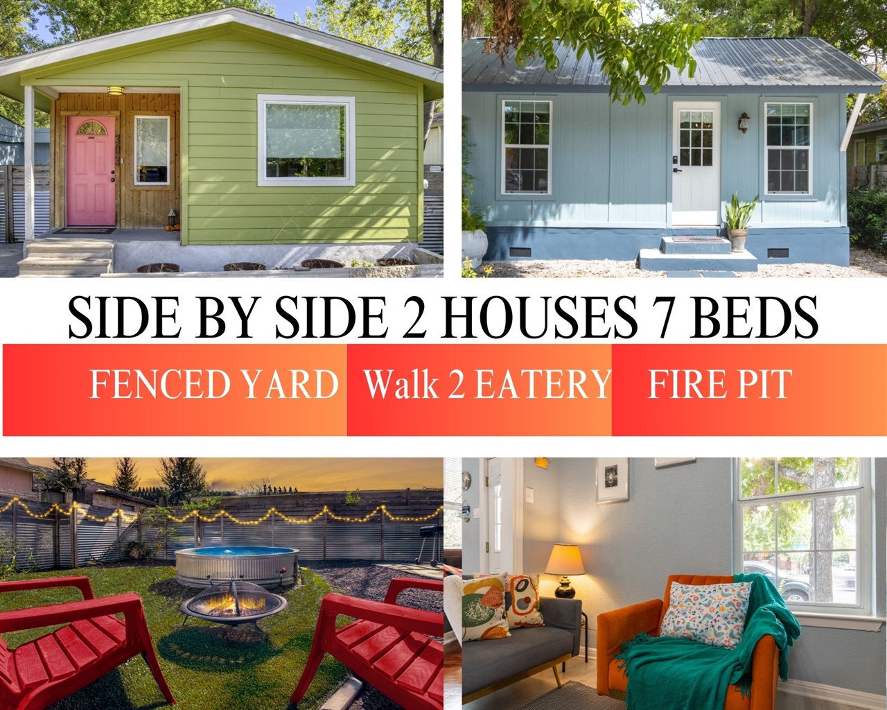 Two house are next to each other, both have fenced yard, parking spaces. Two houses have total 4 bedrooms, 2 bathrooms, extra sleeping sofa in living rooms and gourmet kitchen.